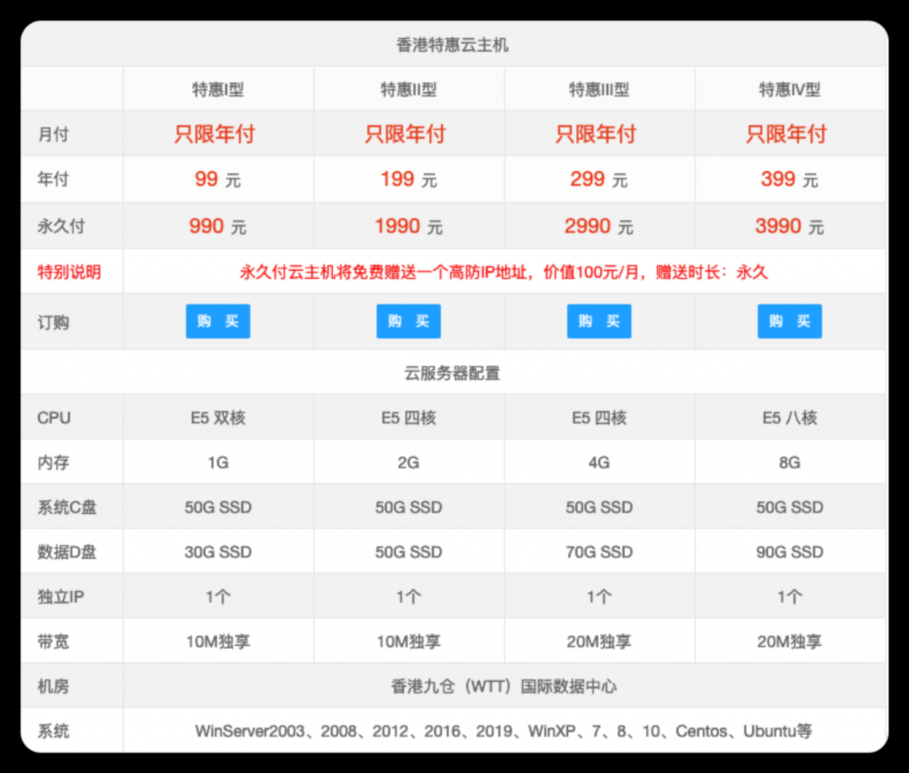 特别说明:特惠云可永久购买,永久付将免费赠送一个高防IP地址,价值100元/月,赠送时长:永久。可永久使用,绝无任何二次收费,可开正规发票,放心购买。