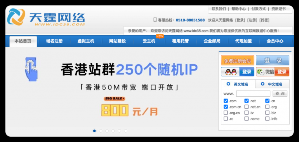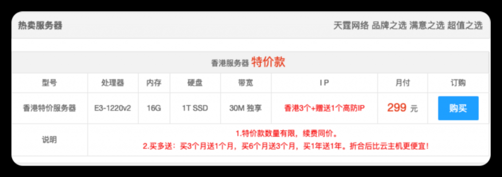 文章来源于互联网:天霆网络:香港站群250个随机IP,50M带宽,800元/月。香港云双核1G,10M带宽,99元/年。香港特价服务器,E3-16G-30M带宽,免费赠送一个高防IP,299元/月