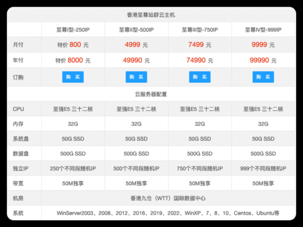 特别说明:与大多数市面上的产品不同,市面上站群大多为连续的IP地址,我们的IP地址为不连续、不同段的随机IP,每台有3个A段并且不少于20个C段,800元续费同价。