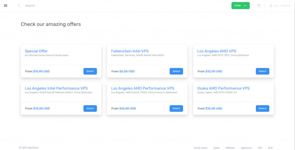 Zgovps是去年开设的一家国人主机商,提供基于KVM架构的VPS主机,数据中心包括美国洛杉矶、日本大阪、德国机房,采用AMD Ryzen9 7950X、EPYC 9354P/7402P、Platinum 8452Y等高端硬件,NVMe SSD硬盘,支持PayPal、支付宝等付款方式。